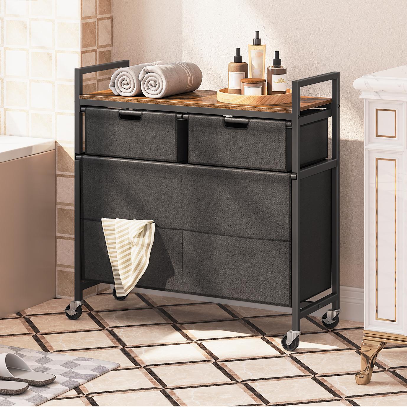 Cette table d’appoint à roulettes se distingue par sa multifonctionnalité unique. Elle intègre un panier à linge avec trois tiroirs qui permettent de trier les vêtements facilement. Associée à une tablette en bois sur la partie supérieure, elle fusionne les besoins de rangement et de surface d’appoint dans une conception astucieuse.
