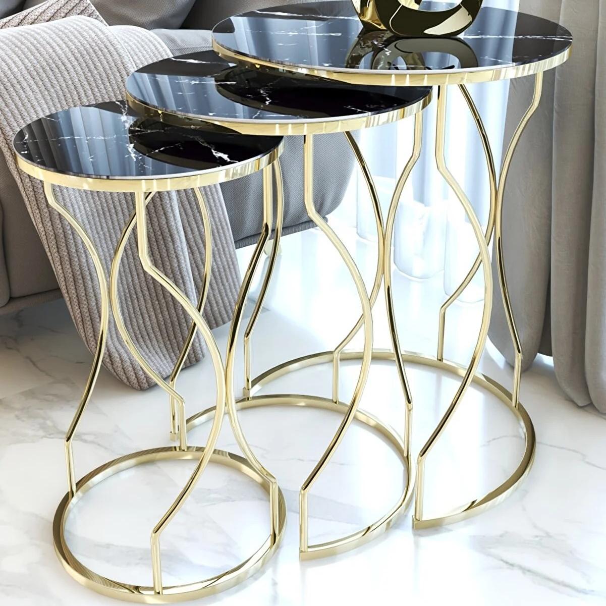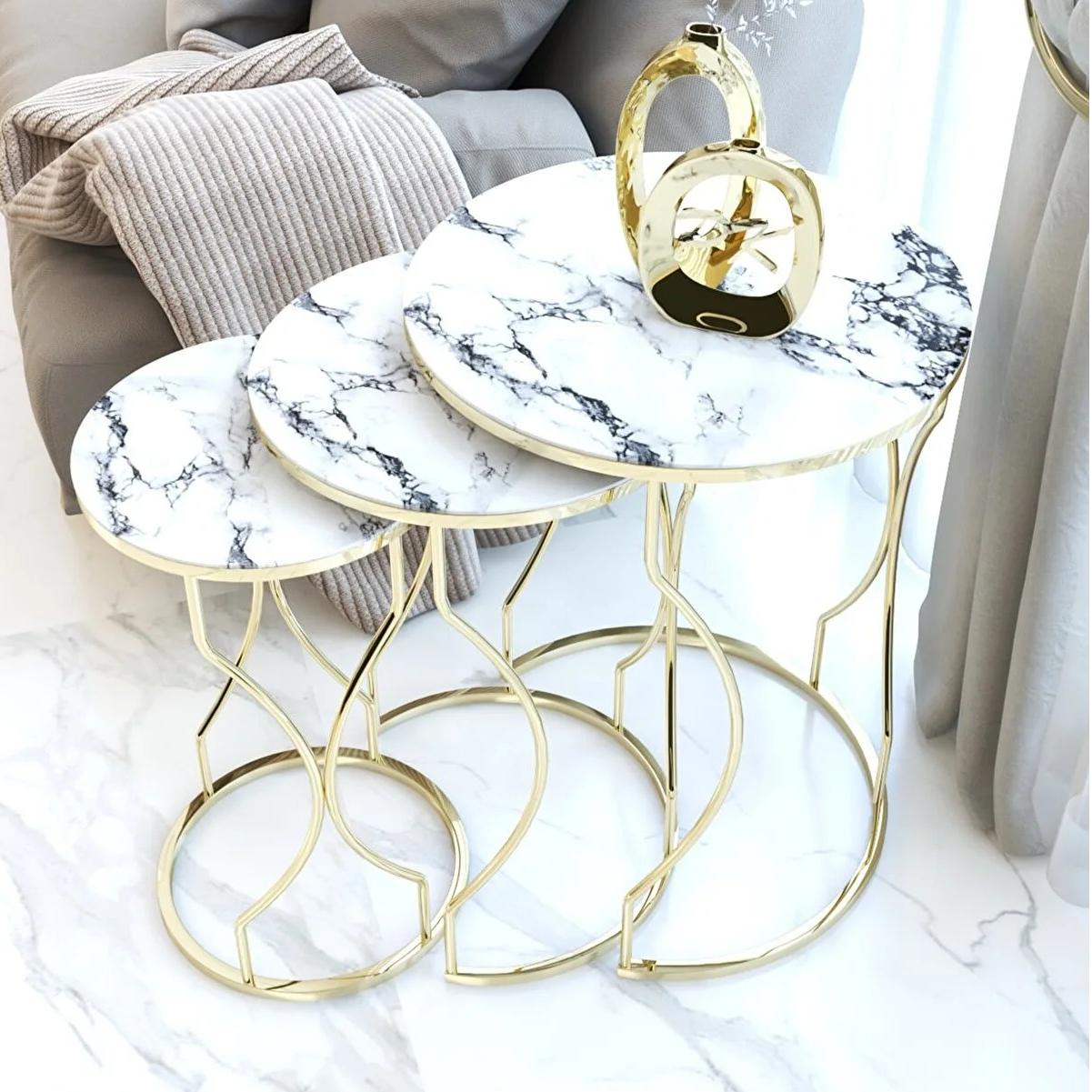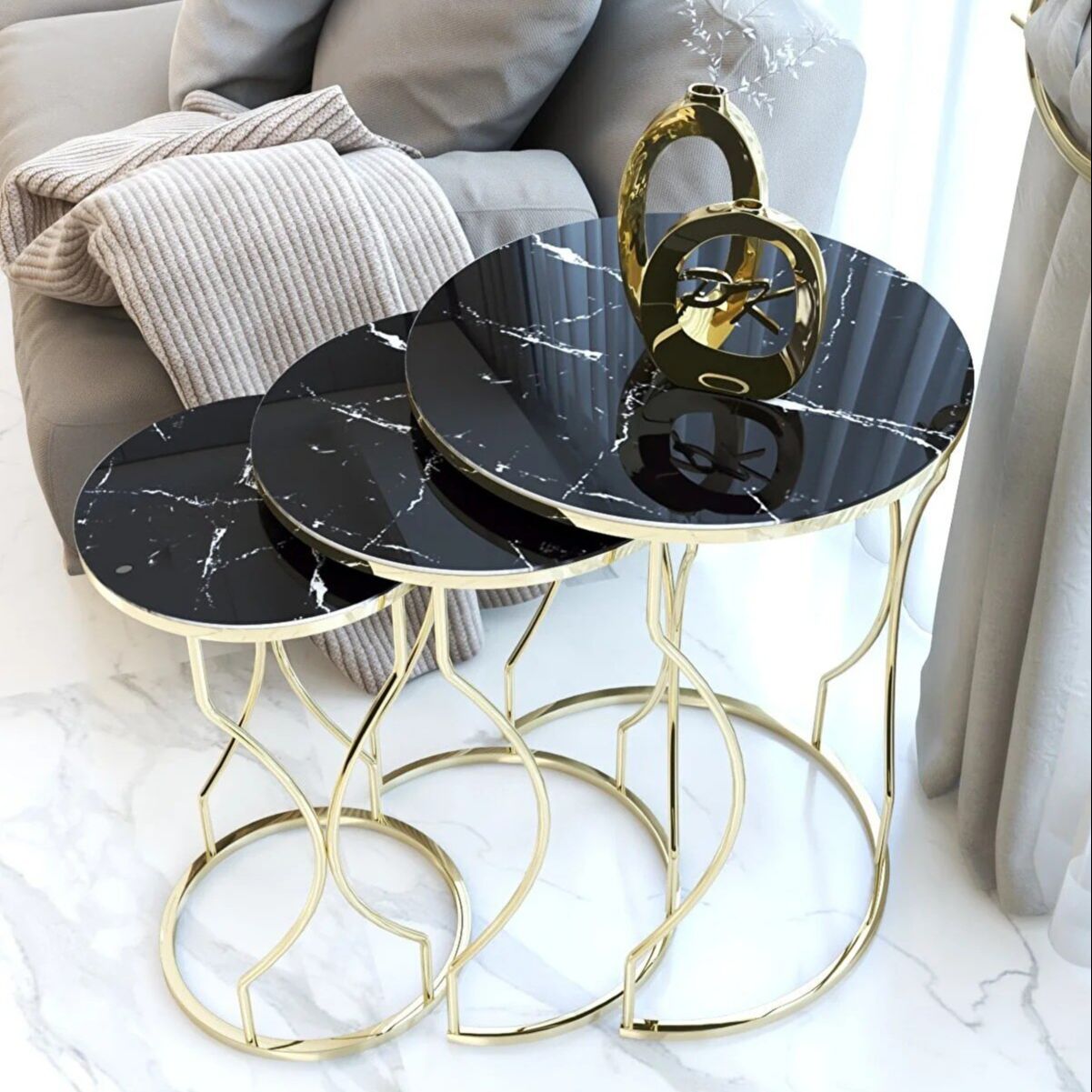 Sublimez votre intérieur avec cet ensemble de trois tables d’appoint gigognes en verre trempé et métal au design de luxe. Ces tables apportent une touche d’élégance à votre espace de vie. La structure en métal doré ajoute une note de sophistication, tandis que les plateaux en verre trempé avec motifs de marbre offrent un aspect raffiné.